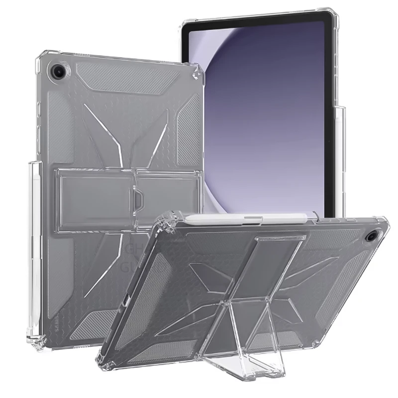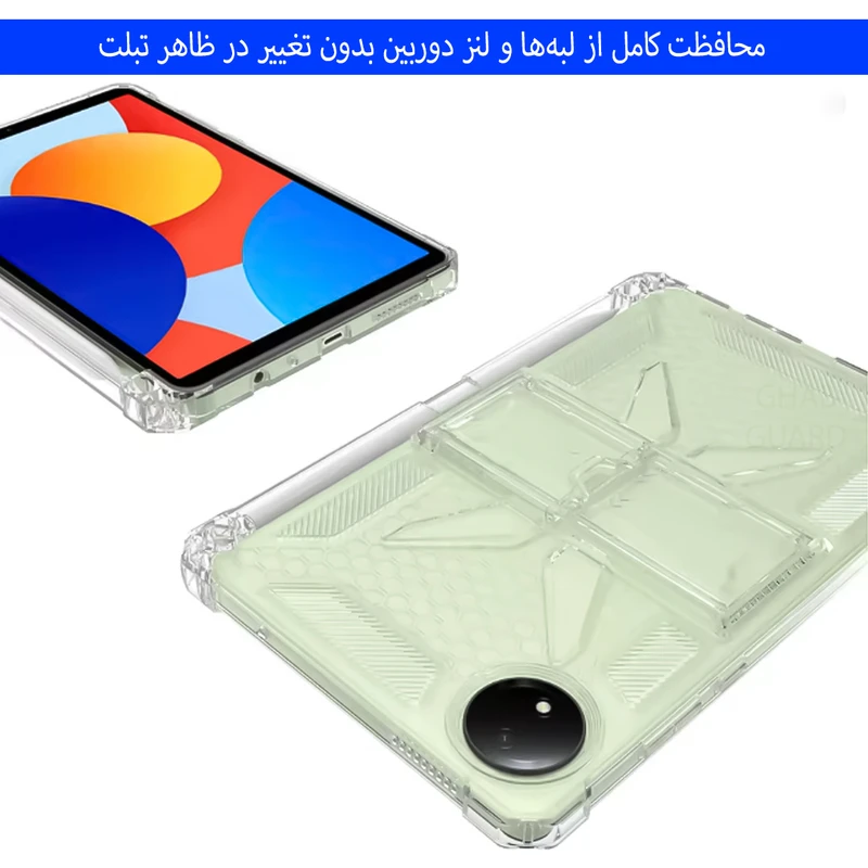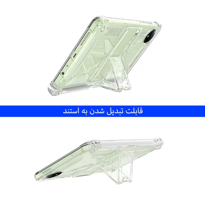 قاب محافظ شفاف X-Stand از برند قاب گارد از جنس TPU، محافظی انعطاف‌پذیر و مقاوم در برابر ضربه و خط و خش می باشد. ایربگ‌های هوشمند تعبیه شده در چهار گوشه قاب، ضربه‌های ناگهانی را به‌خوبی جذب کرده و از آسیب دیدگی تبلت جلوگیری می‌کنند. طراحی دقیق قاب با برش‌های منظم و دقیق، دسترسی آسان به دکمه‌ها، درگاه‌ها و دوربین را فراهم می‌کند و لبه‌های برجسته آن از صفحه نمایش و لنز دوربین در برابر تماس مستقیم با سطوح محافظت می‌کنند. جایگاه مخصوص قلم دیجیتال امکان حمل و نگهداری راحت قلم را بدون گم شدن آن ممکن می سازد. مهم‌تر از همه، قاب کاور X-Stand قابلیت تبدیل شدن به استند در زوایای مختلف را دارد که برای تماشای فیلم، مطالعه، و تایپ بسیار کاربردی و راحت است. این قاب محافظ با ظاهر شفاف و طراحی کاربردی، ضمن حفظ زیبایی ظاهری تبلت، بهترین محافظت را برای تبلت شما فراهم می‌کند.