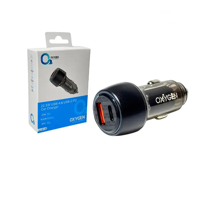 شارژر فندکی خودرو اکسیژن مدل AC08 با بدنه شیشهای، توان ۲۲.۵ وات و دارای دو پورت و قابلیت شارژ سریع