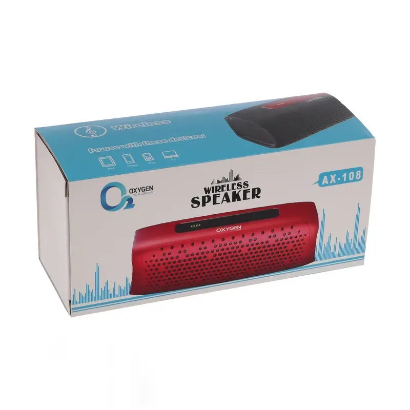 اسپیکر بلوتوثی اکسیژن مدل AX-108 با بدنه فلزی، 4 ساعت پخش موزیک و نمایشگر میزان شارژ